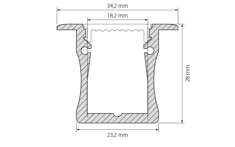 Анодированный профиль 2м Wide-F 28мм встраиваемый в комплекте с матовым экраном. Для лент и линеек шириной до 18мм. Высота 28мм х ширина 23.2мм (34.2мм внешний). Цена за к-т 2м.