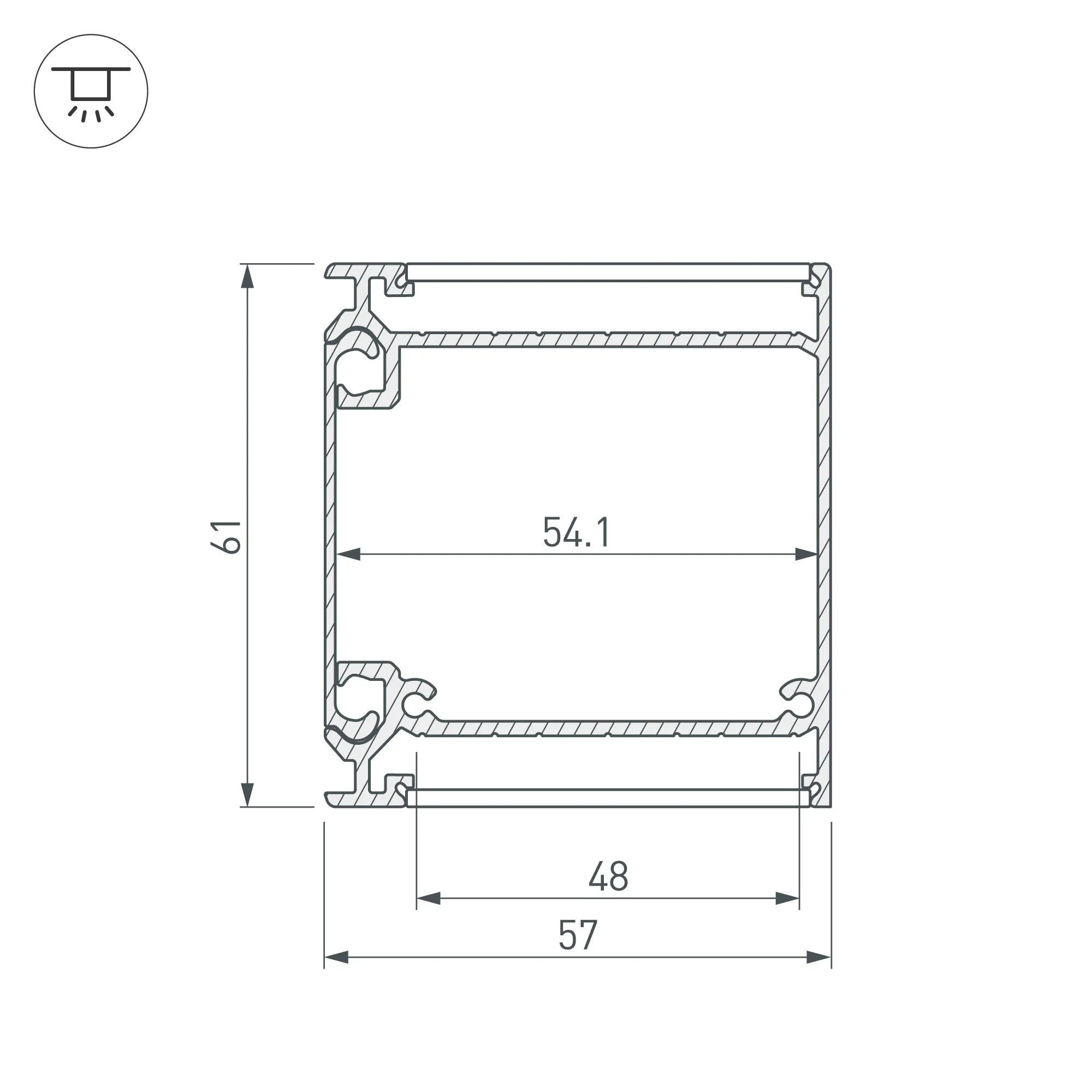 Алюминиевый анодированный профиль для светодиодных лент и линеек, с отсеком для блока питания (размер отсека 47х37мм). Освещение в 2-х направлениях вдоль основания. Габаритные размеры (L×W×H): 2000x57x61 мм. Ширина площадки для ленты 48 мм. Экраны, заглушки и другие аксессуары приобретаются отдельно. Цена за 1 метр.