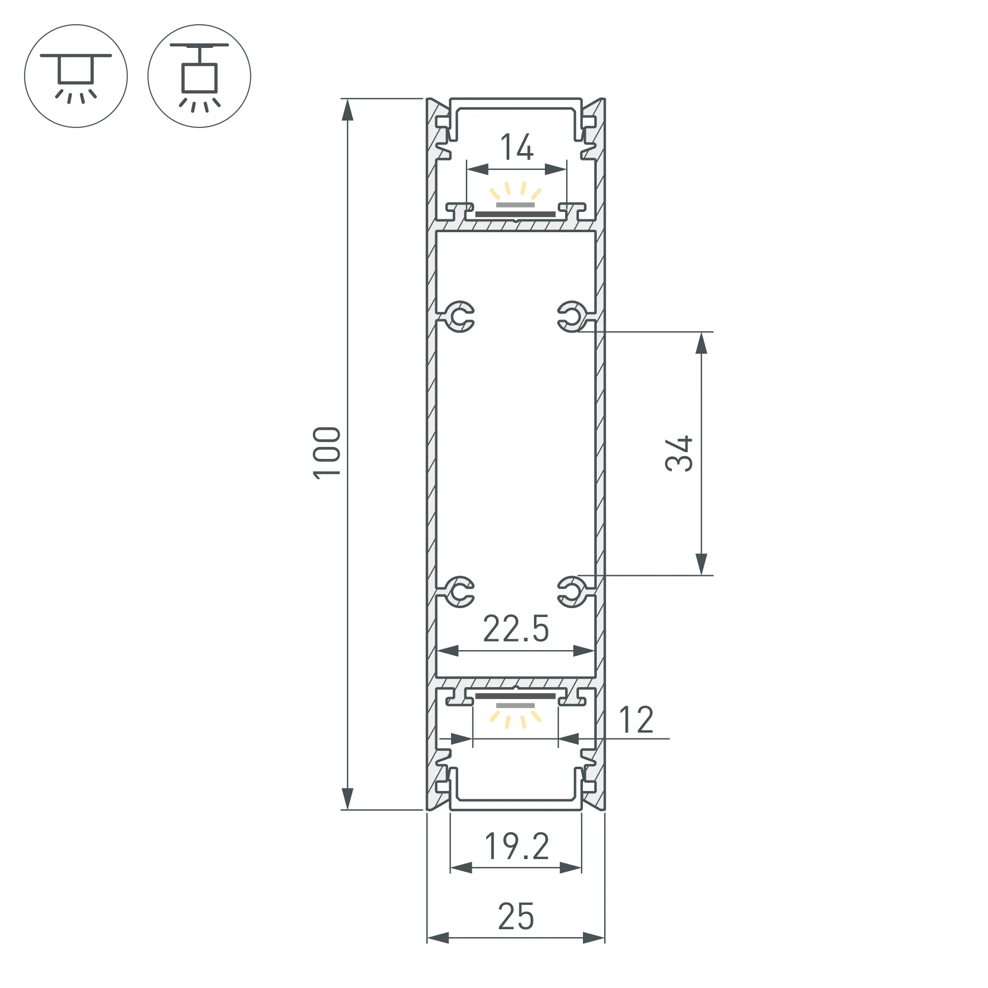 Под заказ от 100 м. Алюминиевый профиль для светодиодных лент и линеек, свечение вверх и вниз. Цвет - мятный RAL6019 (порошковая окраска). Габаритные размеры (L×W×H): 2500x25x100 мм. Ширина площадки для ленты 12 мм. Экраны, заглушки и другие аксессуары приобретаются отдельно. Цена за 1 метр.