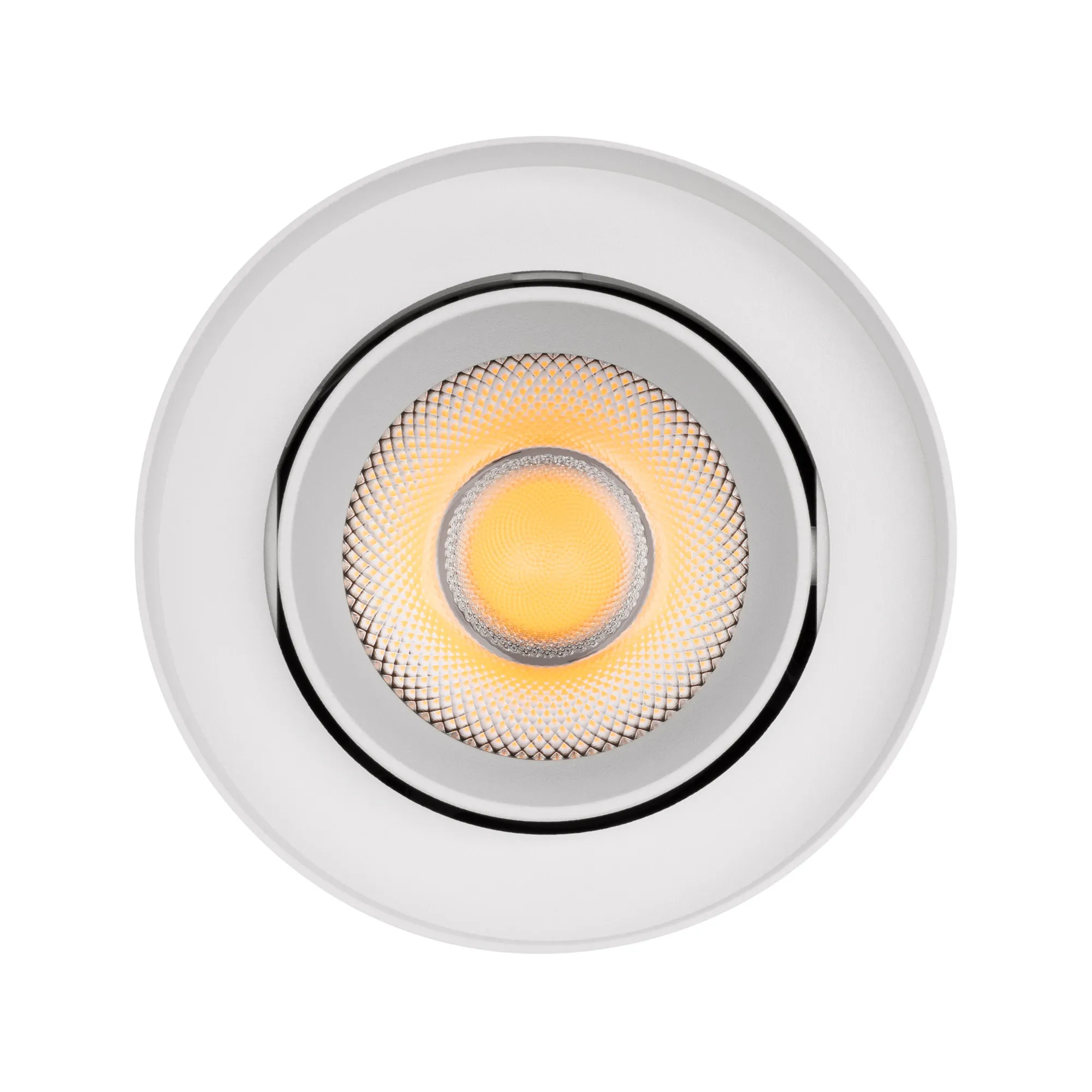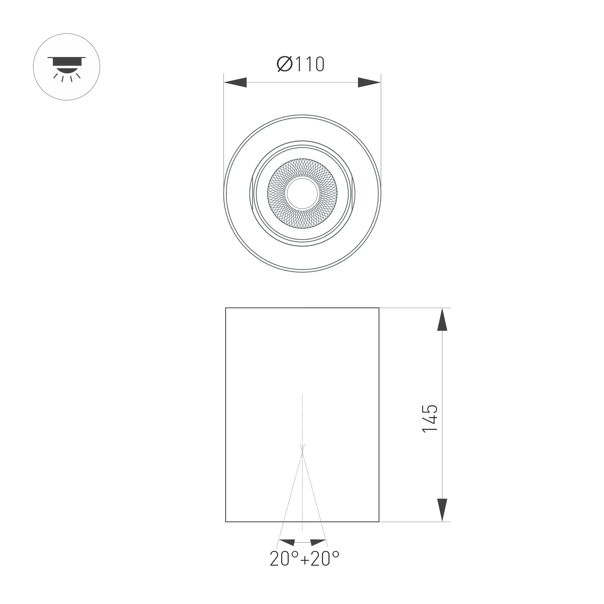 Накладной интерьерный светильник. Мощность 18 Вт, св. поток 1700 лм, 99 лм/Вт, дневной 4000 K, CRI>90, угол 36°, регулируемое направление луча 40°(20+20), поворотный световой модуль вокруг своей оси на 340°, UGR <11, напряжение питания 230 В. Белый круглый корпус из алюминия, степень защиты IP54. Размер: диаметр 110 мм, высота 145 мм. Монтаж накладной. Драйвер 27-43 В, 450 мА, пульсация <1%.