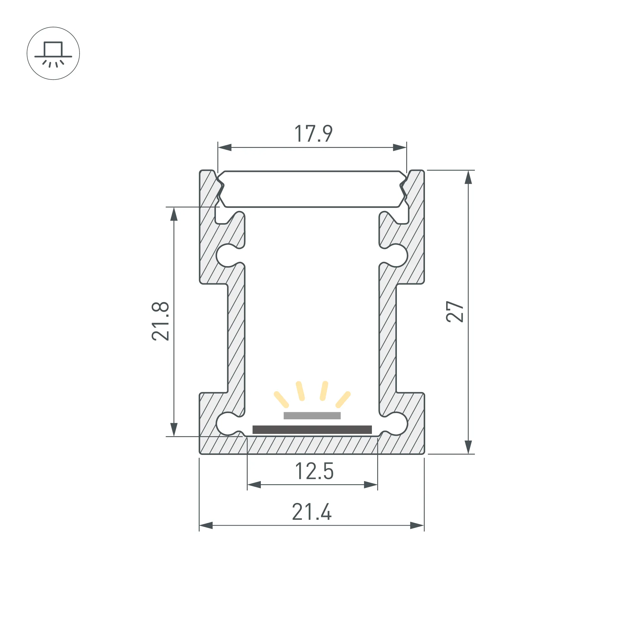Алюминиевый анодированный профиль. Возможность герметизации до IP65 (при использовании силиконового клея для фиксации экрана и заглушек), IK10 (08-10). Габаритные размеры (L×W×H): 2000x21,4x27 мм. Ширина площадки для ленты 12,5 мм. Заглушки и другие аксессуары приобретаются отдельно. Цена за 1 метр.